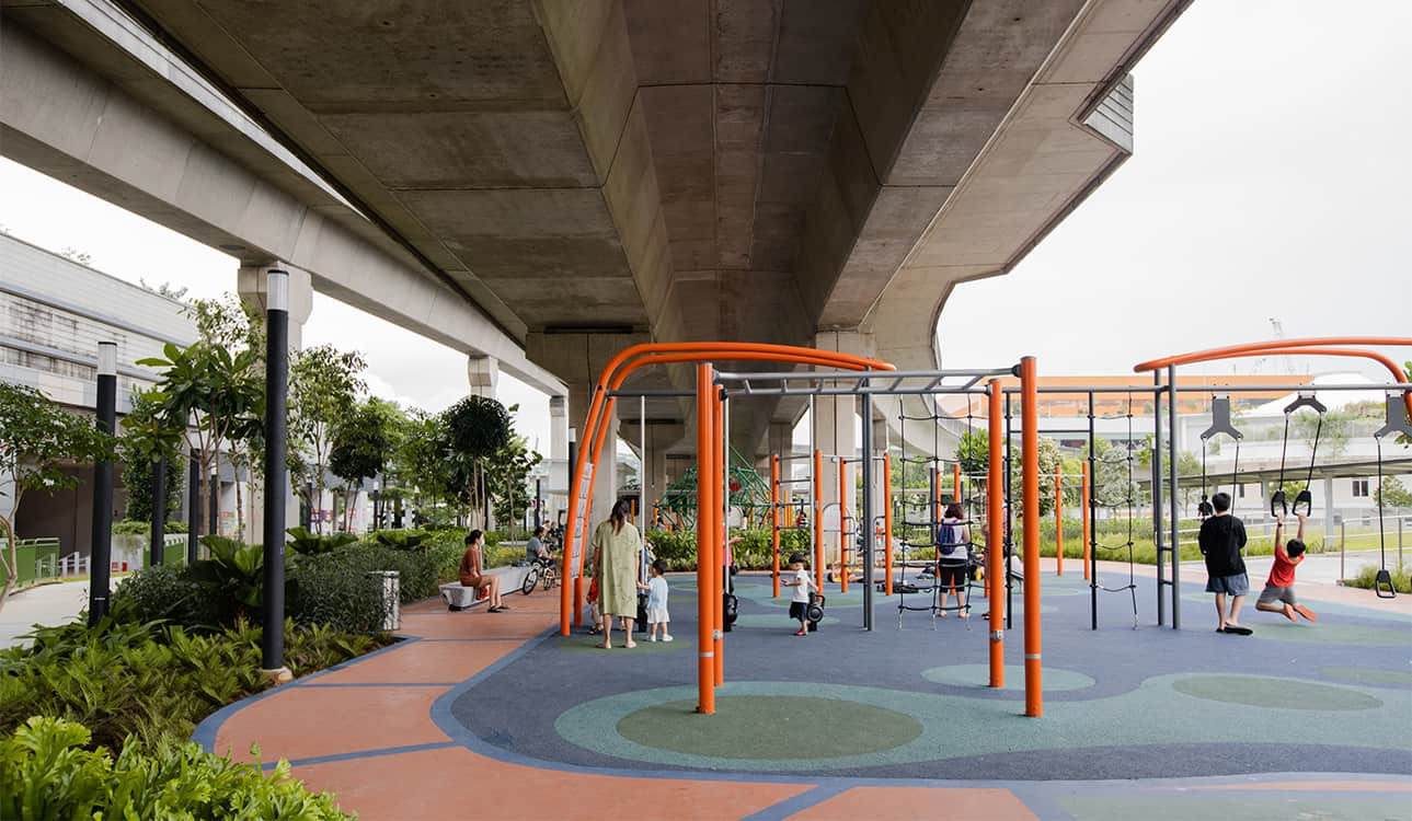 The design embraces a biophilic approach, overcoming the constraints of low-light conditions under the viaduct by selecting a diverse mix of native and exotic plant species. This burgeoning greenscape not only increases urban biodiversity but also mimics the ecological habitats of the nearby coastline. By harmonizing complex drainage and rail structures into a playground of imagination and color, Punggol Green injects joy into everyday living, serving as a restorative sanctuary that elevates the mental and physical wellbeing of the entire community.