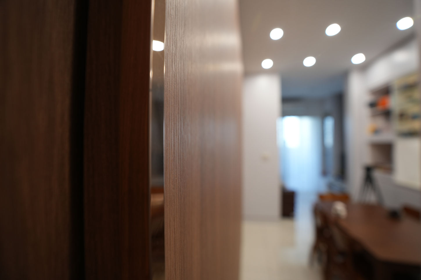 The core of the project lies in its masterful camouflage. In the hallway, rich walnut paneling integrates hidden doors and storage, creating a continuous timber texture that guides the eye toward the living area. This "solid" volume acts as a warm anchor to the home, while delicate metallic accents between the panels add a touch of modern sophistication and depth.